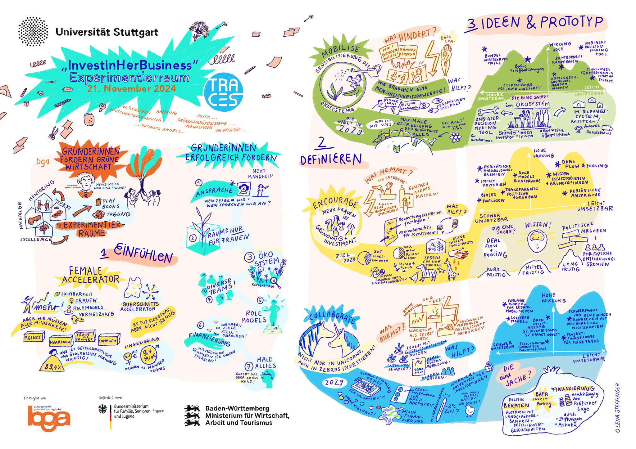 - Konzeptionierung und Umsetzung eines Konzeption und Durchführung eines themenspezi-fischen, innovativen Designsprints, in dem namhafte Fachleute aus den genannten Themen-feldern mit Gründerinnen zusammenkamen, um im Kontext der ausgewiesenen Expertise gemeinsam unter limitierten Zeitressourcen konkrete und innovative Instrumente zu erarbeiten.